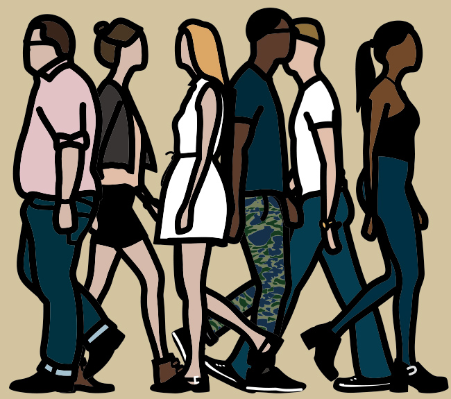 - Born in 1958 in London, Julian Opie still calls London home. He holds a place among the most renowned contemporary British artists. Graduating from Goldsmiths School of Art, he developed a style of figurative work, portraiture and landscapes comprising minimal line and shape through a variety of media, including painting, sculpture and animation. His work can be found in the collections of museums including The Museum of Modern Art in New York, The British Museum and the National Museum of Modern Art, Tokyo. For the piece on the cover of this issue, Opie photographed pedestrians on the street outside his East London studio and assembled them into a crowd.