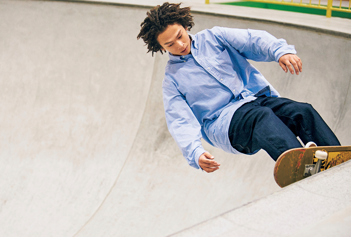 With his button-down Oxford, Ayumu wears the Miracle Air 3D Jeans he helped UNIQLO develop. Having a lighter-than-air weave and a 3D structure, these jeans provide an unbelievable range of motion.
