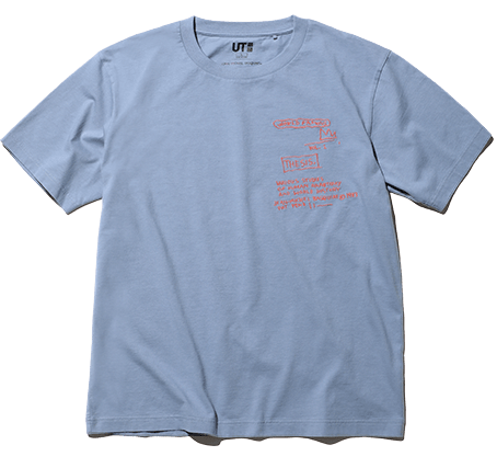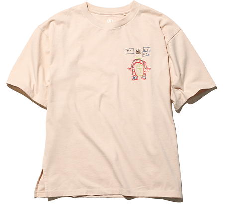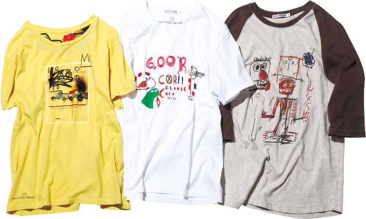 UT has been showcasing the work of Basquiat for many years, but UNIQLO shirts featuring his art appeared as early as 2003, well before UT became a brand in 2007. The three T-shirts pictured above come from the archives of our explorations of the work of Basquiat. An item from 2013 features printing on the inside of the shirt, while a V-neck from 2009 incorporates intricate embroidery, in one of our more technical answers to the question of how T-shirts can be used to showcase art. Meanwhile, the three items from this season on the right page employ simpler designs, focusing on wearability and the question of how to wear art in cool new ways. The cut of these UT shirts has been updated for a better fit. Starting this season, our men's shirts will feature a more relaxed silhouette, while our women's shirts employ a pattern that has roomy, longer sleeves and slightly lowered shoulders, as well as small slits on the sides.