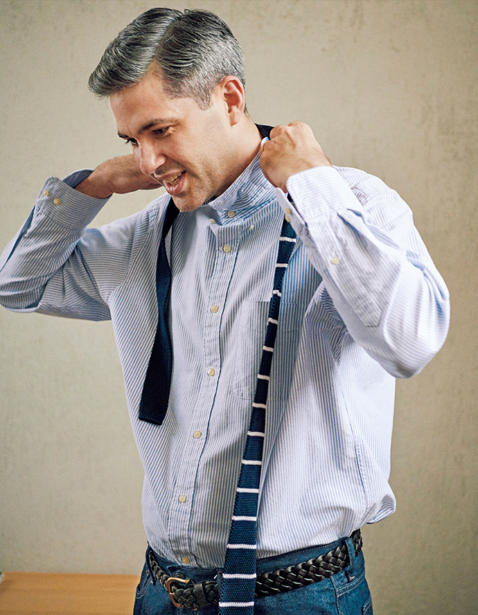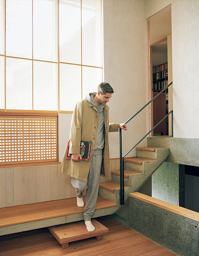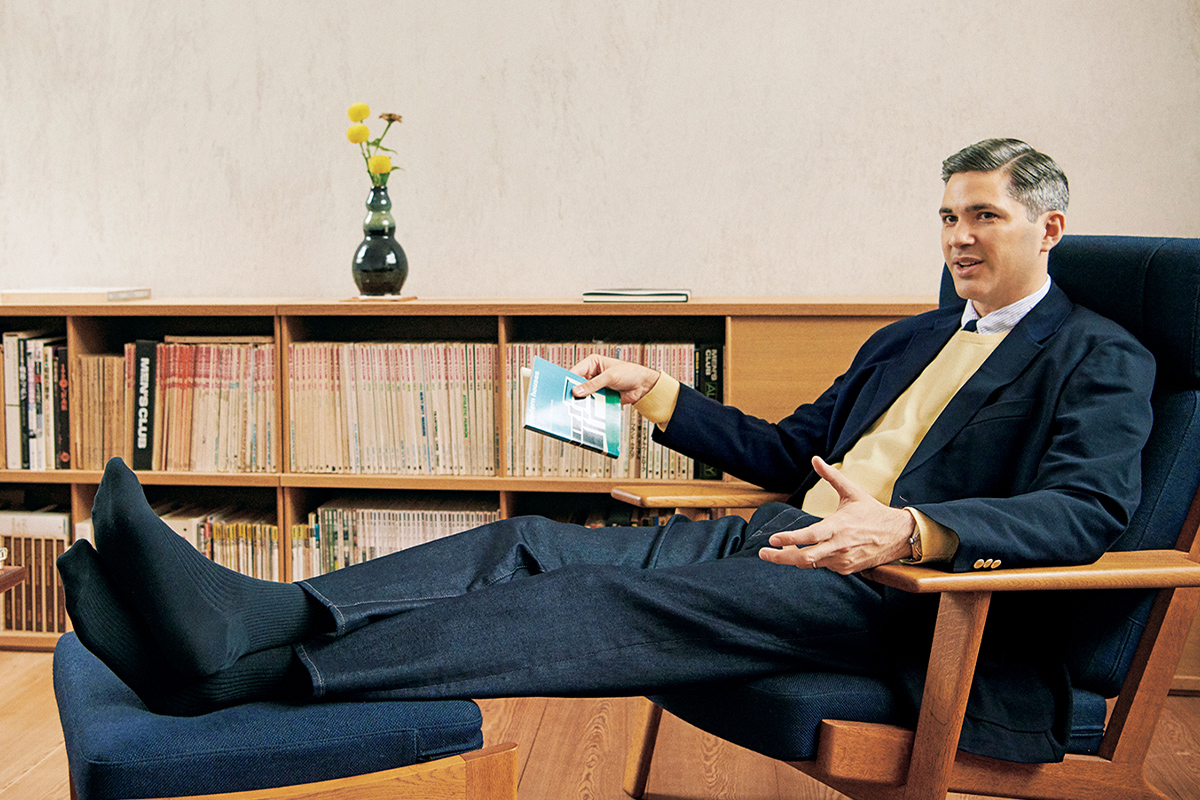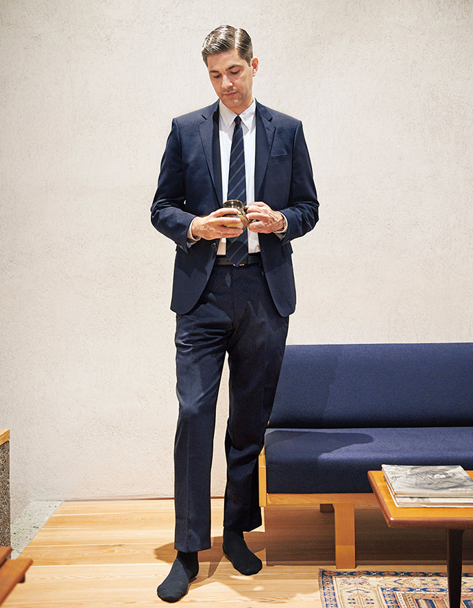 - Born in Oklahoma, USA. In 2015, he published Ametora: How Japan Saved American Style, which analyzes Japanese men’s fashion from a sociological perspective on the basis of extensive research. Already translated into Japanese, Taiwanese, and Chinese, it will soon be made available in Korean. Marx has lived in Tokyo for 17 years. His new house, completed last year, was designed by architect Tamotsu Teshima. The split-level layout gives the house an organic three-dimensional feel, perfectly suiting his family of four. David, who stands tall at 193 cm, strives for the perfect fit in his suits and shirts as well. Our special-order service* allows him to dress in suits made just for him.