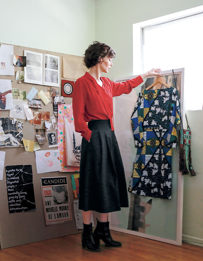 “I think this style is very elegant,“ Miranda says, describing her blouse. “A very subtly sexy way to be an adult. I’m wearing it open, instead of tying it. There is something beautiful and elegant about the way these two lines cross the midline of your body.“ The dress hung here is a gift sent from Niger, handsewn by the sister of Oumarou Idrissa, a collaborator on a few of Miranda’s projects, whom she happened to meet in Los Angeles when he was her ridesharing driver.