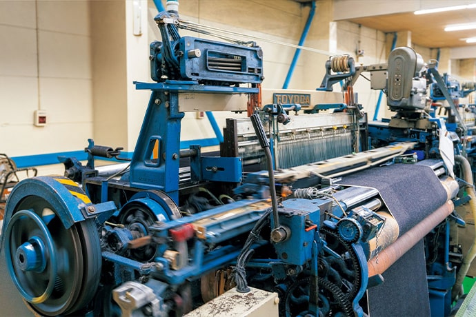 Selvedge denim being made on an old Toyoda G9 power loom. The sound of the shuttle beating down the weft yarn echoes with a shrill clang through the factory.Next, the weft yarn is beaten down into the dyed warp yarn on old G9 shuttle looms to create selvedge denim, which has bands on both edges of the fabric that prevent it from unravelling. Compared with today’s innovative looms, which are controlled by computers, these old machines operate at about 1/6th the speed. After 24 hours of full operation, they produce only 120 meters of material. Since they demand the care, day and night, of seasoned engineers, the process requires considerable time, attention and labor. All the same, the fact that using this kind of machinery results in a completely different texture five years down the line is evident the second you set eyes on the old pair.