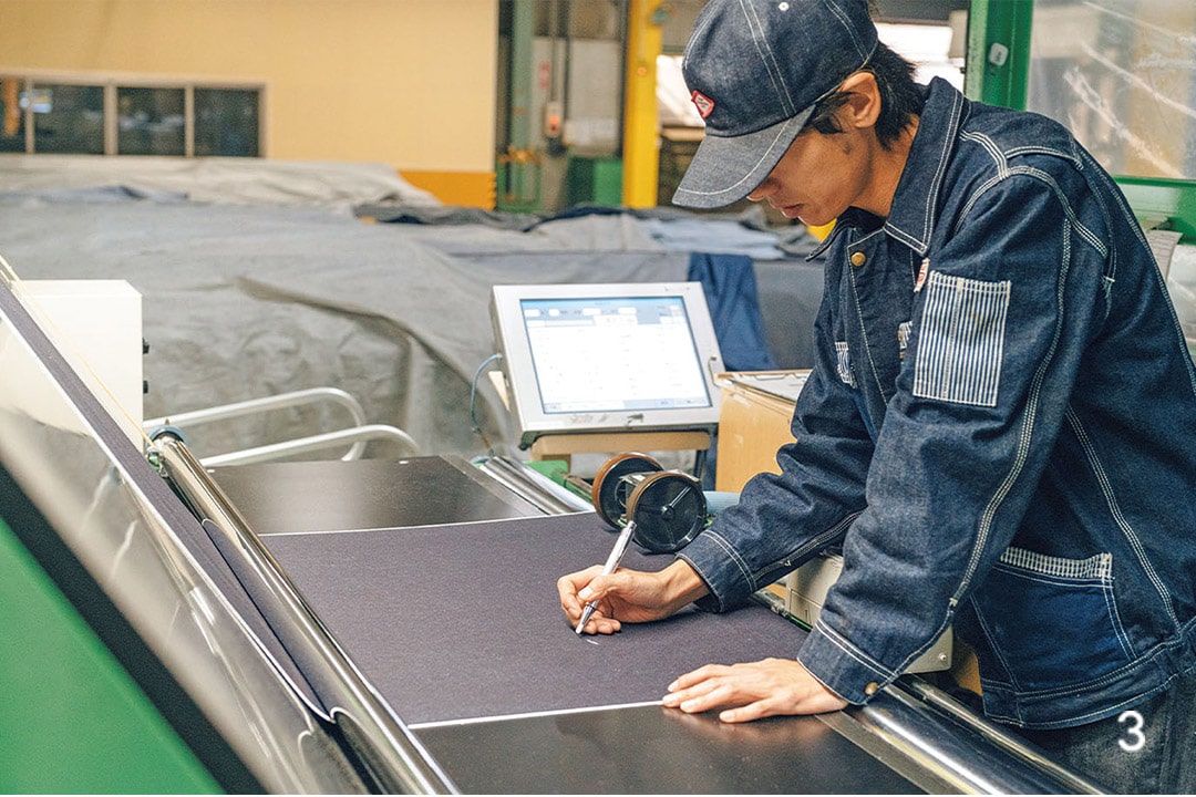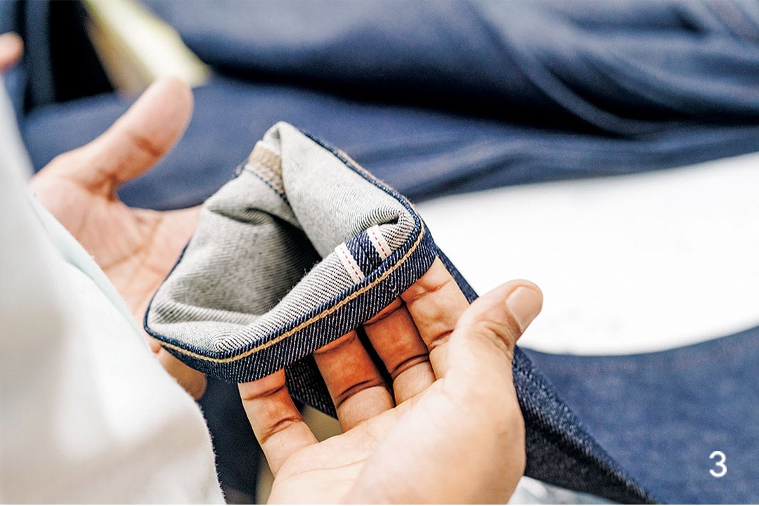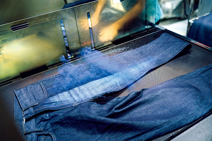Set the jeans inside the laser marking machine and press a button, and the laser makes a pass. In the blink of an eye, the clothes look broken in.The amount of inspection that goes into every step is a sight to behold. The fabric has already been subjected to thread strength and rip testing at the Kaihara lab throughout the spinning, weaving and packing steps, but the checking continues in the sewing step as well, with measurements taken down to the millimeter. Since sewing is not fully automated but rather done by hand on sewing machines, it’s possible for irregularities, fraying and damage to occur, but such defects make garments unfit for sale. Strict inspection standards encourage the creation of the finest possible product, the result of which is high-quality denim having the durability it needs to be worn year after year and only look better with age.