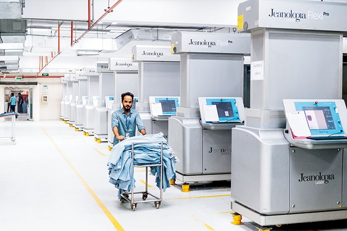 Rows of state-of-the-art laser marking machines. Jeans that have gone through ozone washing are given fine distress marks and ripped details.