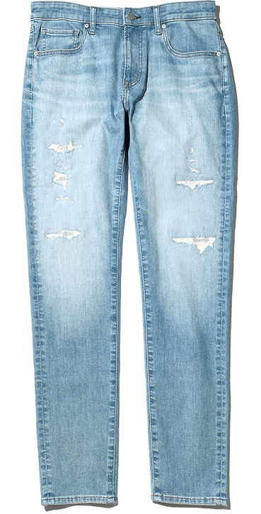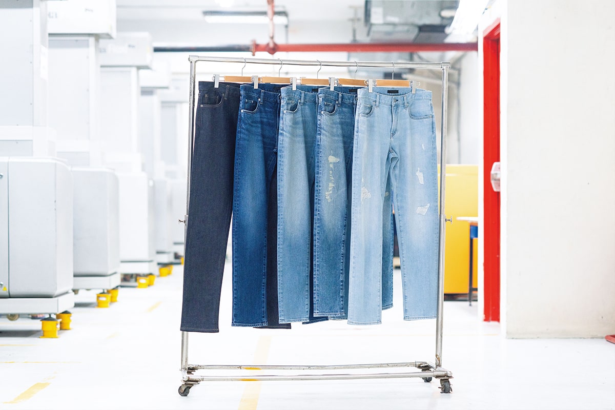 On the far left is unprocessed selvedge denim, followed by four pairs of finished jeans. An amazing range of variation can be achieved by adjusting the strength of the process. Stretch Slim Fit Jeans ¥3,990 (each)