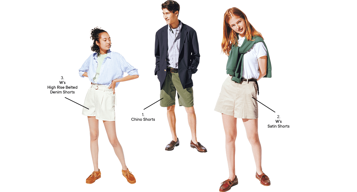 After linen, shorts are the essential summer garment. On hot days, it’s nice to feel the air on your skin. 1. Wear chino shorts with a brass-button blazer for a preppy ensemble. Our Comfort Blazer is cool even in summer. 2. This pique polo, braided leather belt and green sweatshirt make for a classic sporty style. 3. Striped linen shirt with ring-belted, pleated shorts. White shorts look great against sunkissed skin.
