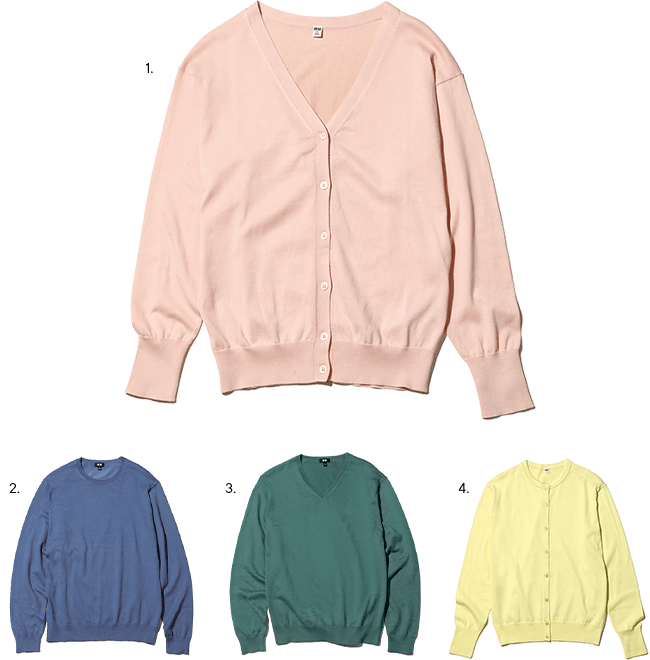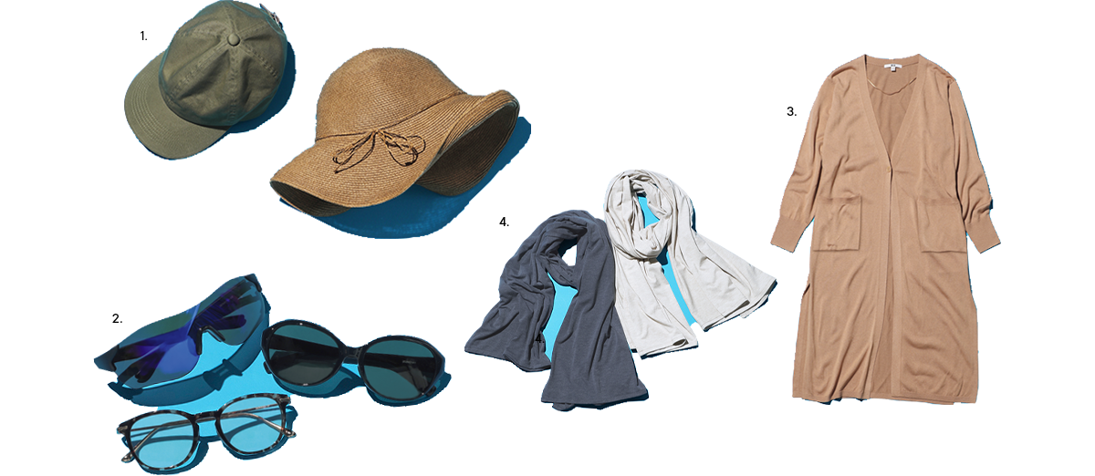 A little excess here and there will add up down the line. Protect yourself against the summer sun with these handy items you can wear on the go. 1. Starting this season, we’re using UV-blocking textiles in our twill cap. The wide-brimmed hat beside it is made from a cool, light paperlike material. 2. Sunglasses are a must-have. Classic sporty styles and clear lenses alike can block out UV radiation. 3. This long cardigan is the sort of wearable sunscreen you can put on anytime. Airy and comfortable, great for summer workdays. 4. Scarves made using AIRism, for keeping your neck fresh even when you’re sweating.