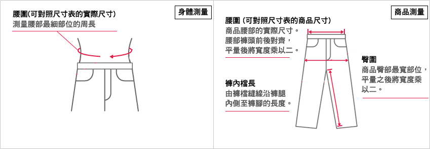 ※由於測量的人或方式不同,測量結果可能與實際尺寸有0.5-1公分之誤差,請在提供褲內檔長時勿提供過於剛好的長度,