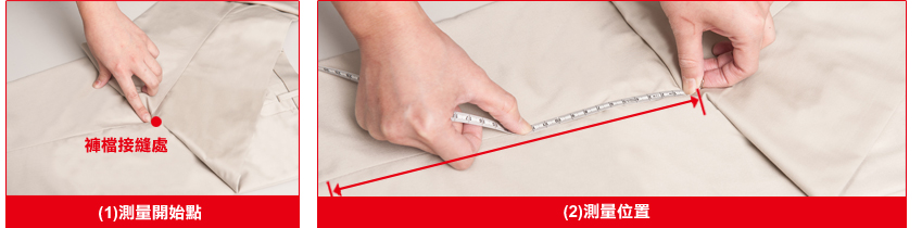 (2)自褲檔接縫處開始沿著褲管邊緣,一直量到褲腳為止的長度,測量方式與牛仔褲注意事項相同。