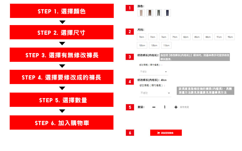 「褲長修改服務」操作說明 ※此為購買商品時PC版頁面操作示意圖