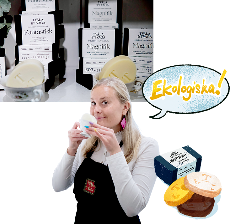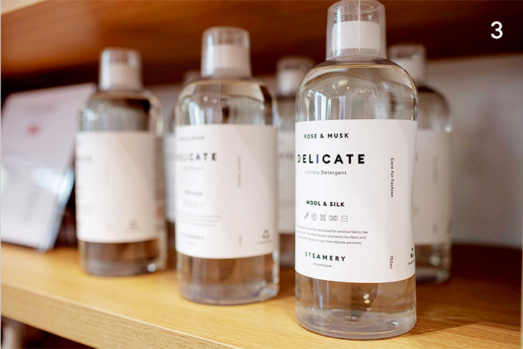 1. “SWE” graphic tee, in support of Swedish athletes. Sixty percent of the fabric is polyester made from recycled plastic bottles. Designed by Kosuke Kawamura. 2. Part of an upcycling project in which local students mix and match fabric scraps to give old clothes a new life. 3. Eco-friendly detergent from Steamery. 4. Illustration by local artist Mikael Selin.