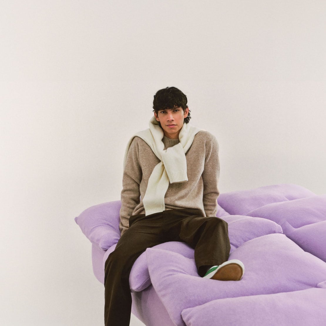 model relaxing on a giant lilac cushion while wearing UNIQLO knitwear