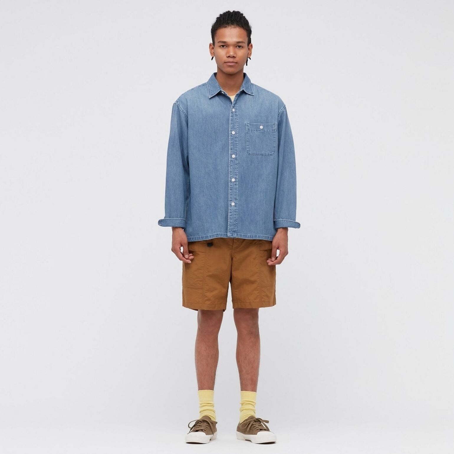 Up for a summer walk along the beach, but it's too windy? The combination of our oversized denim shirt and nylon utility geared shorts is perfect for unpredictable weather. When the sun comes out, just roll up your sleeves or wear the shirt open as a light jacket.