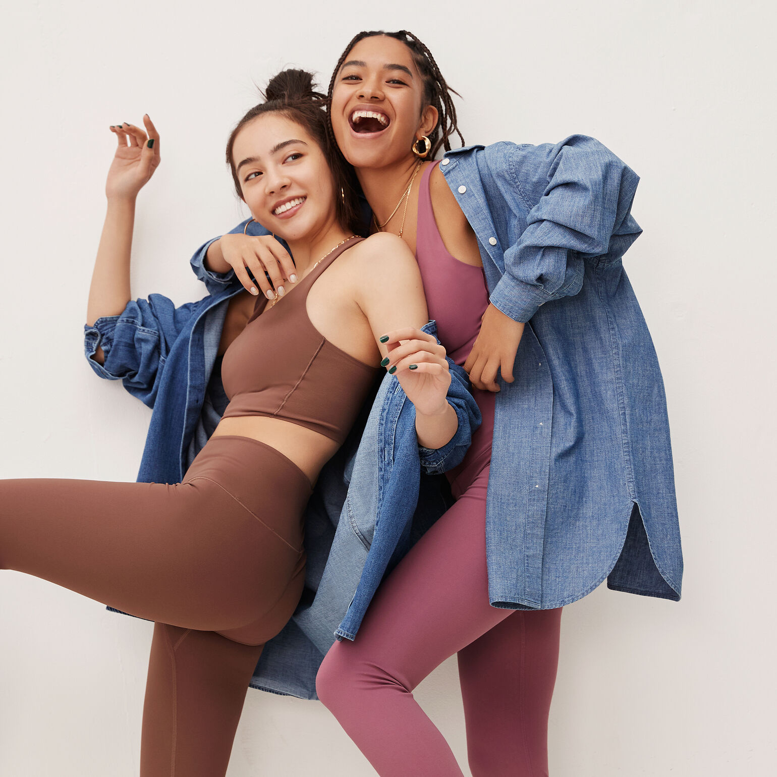 Model left wears: UV Protection Bucket Hat, Square Neck Active Wireless Bra, Ultra Stretch High Rise Leggings Trousers, Denim Oversized Grandad Collar Shirt