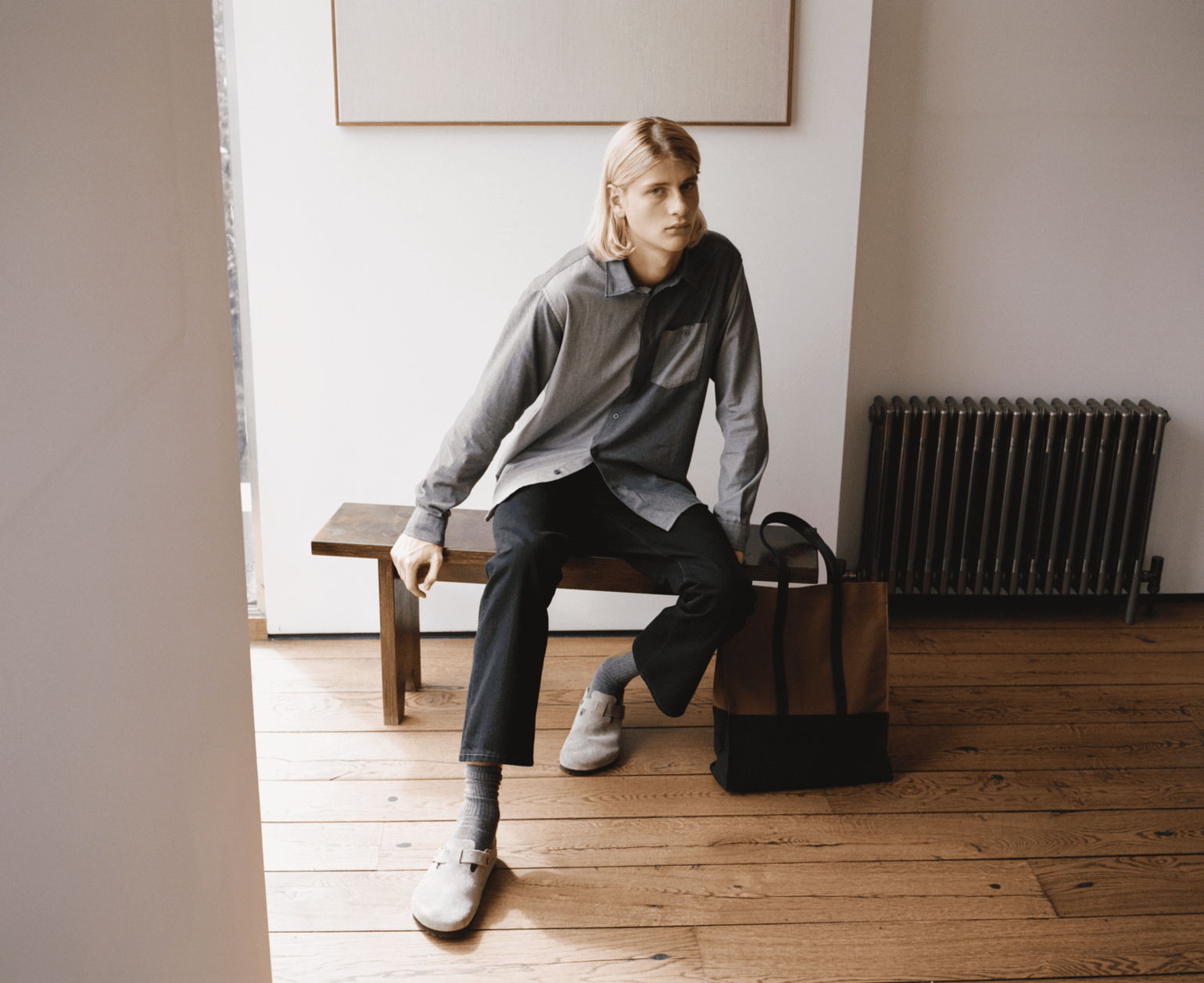 Shop the look: JW Anderson flannel shirt, JW Anderson HEATTECH warm lined trousers, JW Anderson HEATTECH anti-odour colour block socks and JW Anderson tote bag