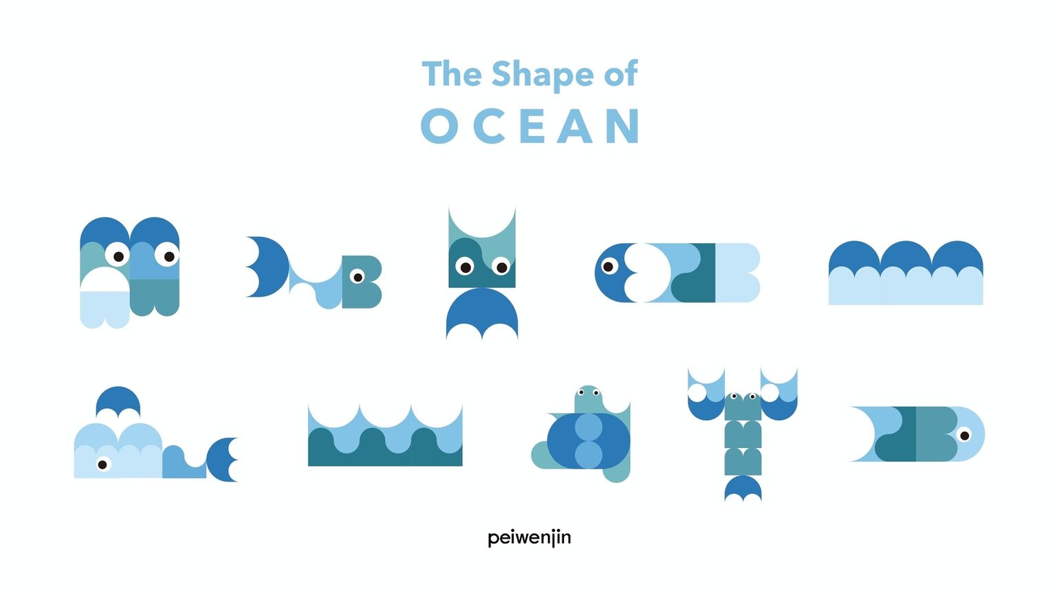 Drawing on her expertise in modular geometric design, Pei-Wen Jin created a set of tangram puzzle patterns inspired by marine shapes. These patterns divide a rectangle into four oceanic modules, allowing for countless combinations to depict various oceanic contours and marine life.