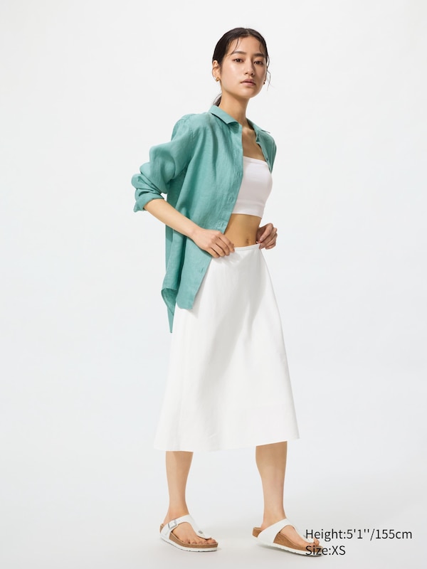 Our versatile women’s Linen Blend Midi Skirt is designed for warm‑to‑mild weather dressing, featuring a simple silhouette that transitions easily from casual daytime outfits to more polished looks. The midi length offers balanced coverage and fluid movement, while the bias cut allows the fabric to fall naturally around the waist and hips, for an easy, comfortable fit that is not restrictive. Made from a linen‑blend fabric, it reflects the characteristic texture and breezy feel associated with linen, balanced with a smoother feel for everyday wear. The streamlined shape pairs naturally with fitted tanks, relaxed T‑shirts, lightweight knits, or layered shirts, making it a dependable option for seasonal wardrobes. Compared with structured woven skirts or heavier mid‑weight fleece styles, this skirt feels lighter, while remaining more refined than casual jersey or French terry alternatives.