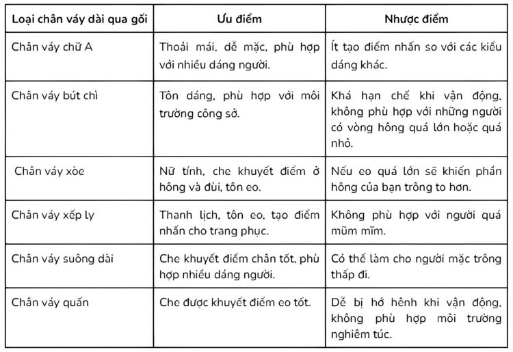 Chân váy dài qua gối có nhiều loại thiết kế kiểu dáng đa dạng, mỗi loại chân váy có những ưu và nhược điểm khác nhau. Dưới đây là chi tiết ưu, nhược điểm của các loại chân váy dài qua gối phổ biến: