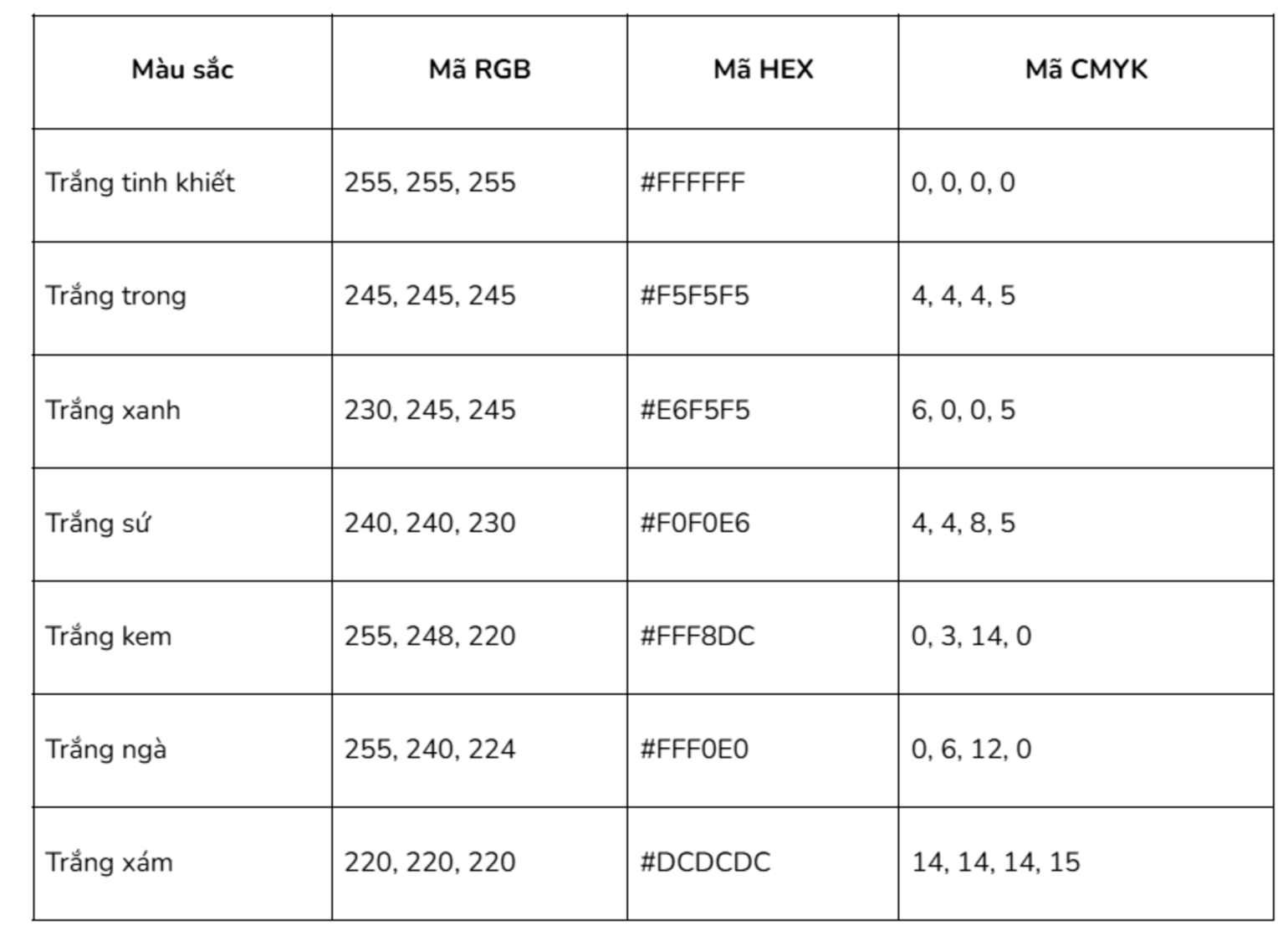 Trong thiết kế đồ họa và kiến trúc, màu trắng không chỉ là một gam màu cơ bản mà còn mang nhiều sắc thái tinh tế, ảnh hưởng trực tiếp đến cảm nhận thị giác và tính ứng dụng của sản phẩm. Dưới đây là bảng tổng hợp các sắc độ trắng thường gặp, kèm theo mã màu tương ứng để bạn có thể dễ dàng tham khảo: