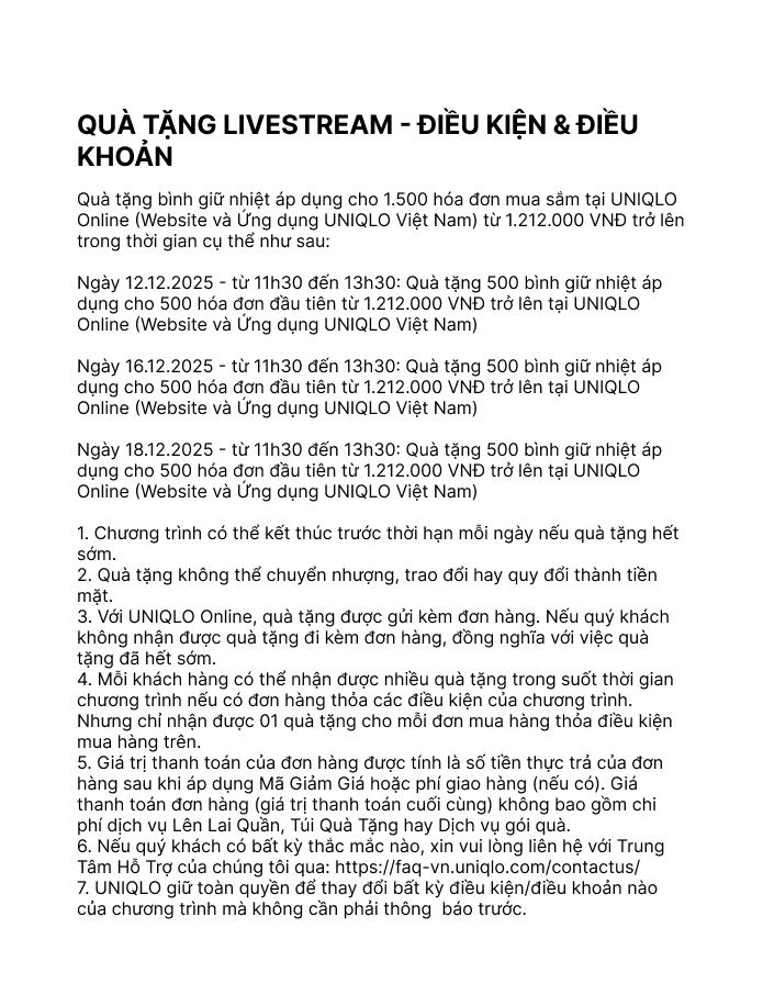 - Ngày 18.12.2025 - từ 11h30 đến 13h30: Quà tặng 500 bình giữ nhiệt áp dụng cho 500 hóa đơn đầu tiên từ 1.212.000 VND trở lên tại UNIQLO Online (Website và Ứng dụng UNIQLO Việt Nam)