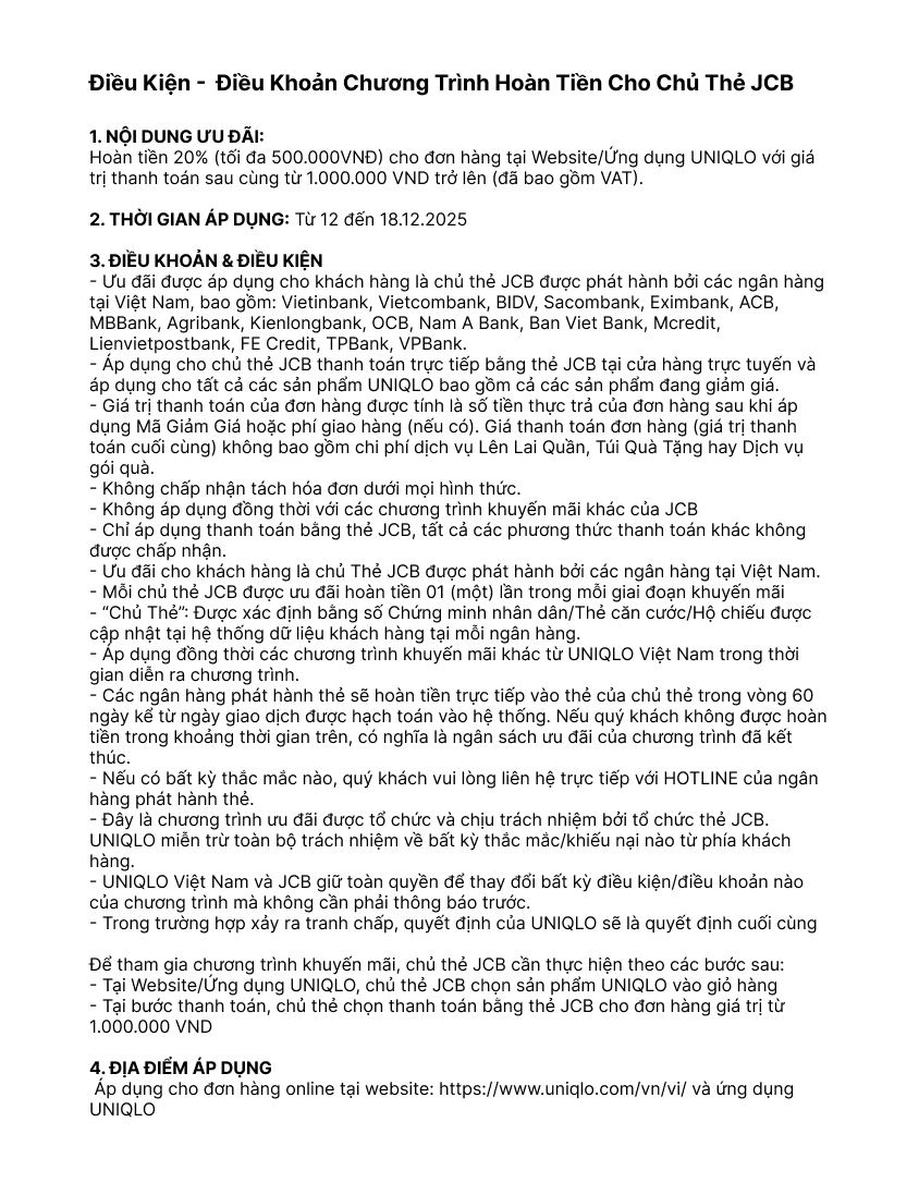 Hoàn tiền 20% (tối đa 500.000 VND) cho đơn hàng tại Website/Ứng dụng UNIQLO với giá trị thanh toán sau cùng